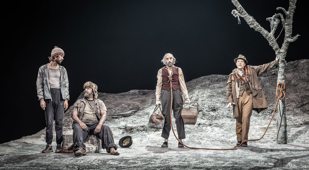 The role of Pozzo is usually played as a sadistic milord, like Oswald Mosley roaming his estate looking for bumpkins to shout at, but Jonathan Slinger finds strange depths and touches of lyricism in the role. On stage, he seems to be improvising his lines as he works his way towards a heart-warming and vulnerable eccentricity. Not a nasty bounder but a broken prophet searching for his starting point and his destination. There’s more than a touch of Ralph Richardson about this mischievous, off-beat, teasing performance. How fitting that Pozzo should speak the play’s best-known lines about life’s futility: ‘They give birth astride a grave, the light gleams an instant, then it’s night once more.’