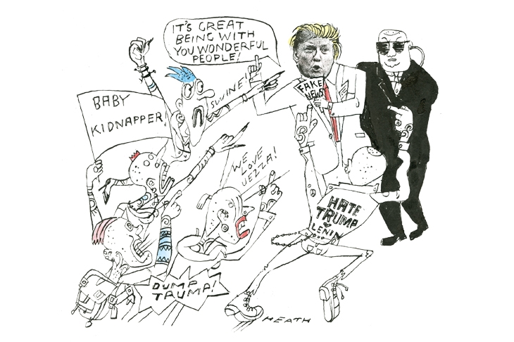 The answer, apparently, is to join the protests against Donald J. Trump, the 45th President of the United States, as he visits Britain next week. Britain’s ‘Stop Trump’ campaign has been busy organising a ‘carnival of resistance’, and it looks as if they’ll put on one hell of a virtue show. Perhaps the most ludicrous proposal is to have a specially made Trump Baby, a six-metre-tall inflatable blimp of the President as an infant wearing a nappy, to float high and huge above him.