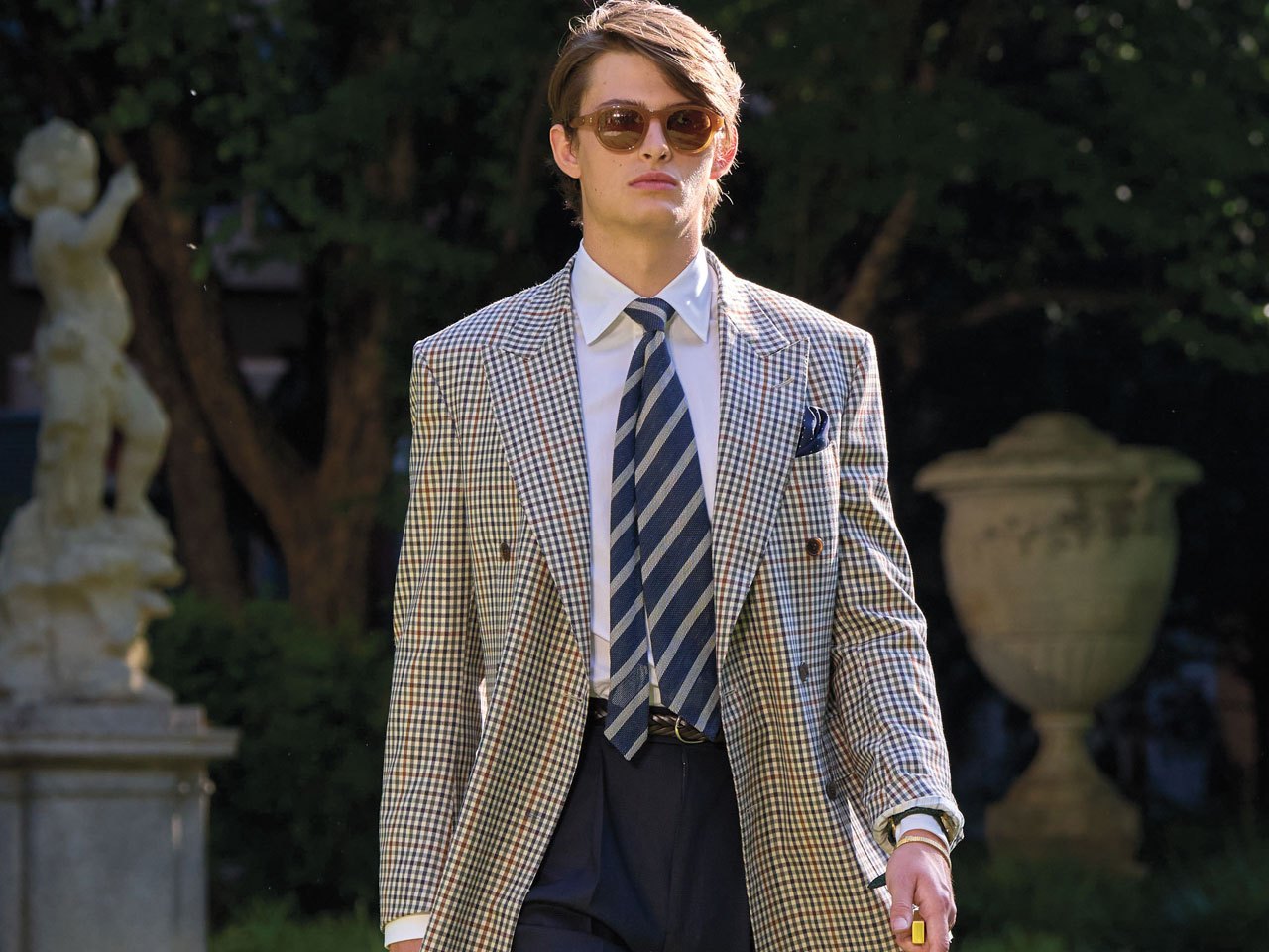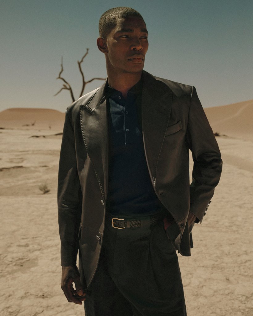 In turn, the blazer has featured heavily in seasonal collections and represents the “tip of the spear” in terms of tailoring sales, says Holloway. Within Dunhill’s spring/summer ’26 collection, based loosely on the “carefree spirit” and sartorial elan of rock icons such as Bryan Ferry, one blazered look appears almost to have been lifted from a Roxy Music video. An unlined, double-breasted blazer in pale, gun club checked wool worn with pleated navy slacks, a club tie, suede loafers, and with the jacket’s cuff turned back to reveal a vintage watch. “That’s a great way to do the English blazer in a modern way.”