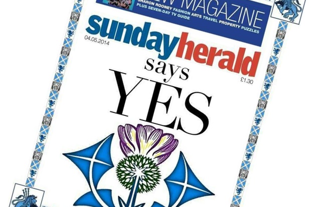 If you are going to declare a clear political affiliation, you might as well do it big. In cricketing terms, if you are going to slash at the ball, slash hard — and that is exactly what the Sunday Herald has done this morning. ‘Sunday Herald says Yes,’ is the front page headline above an illustration by artist and Nationalist Alasdair Gray.