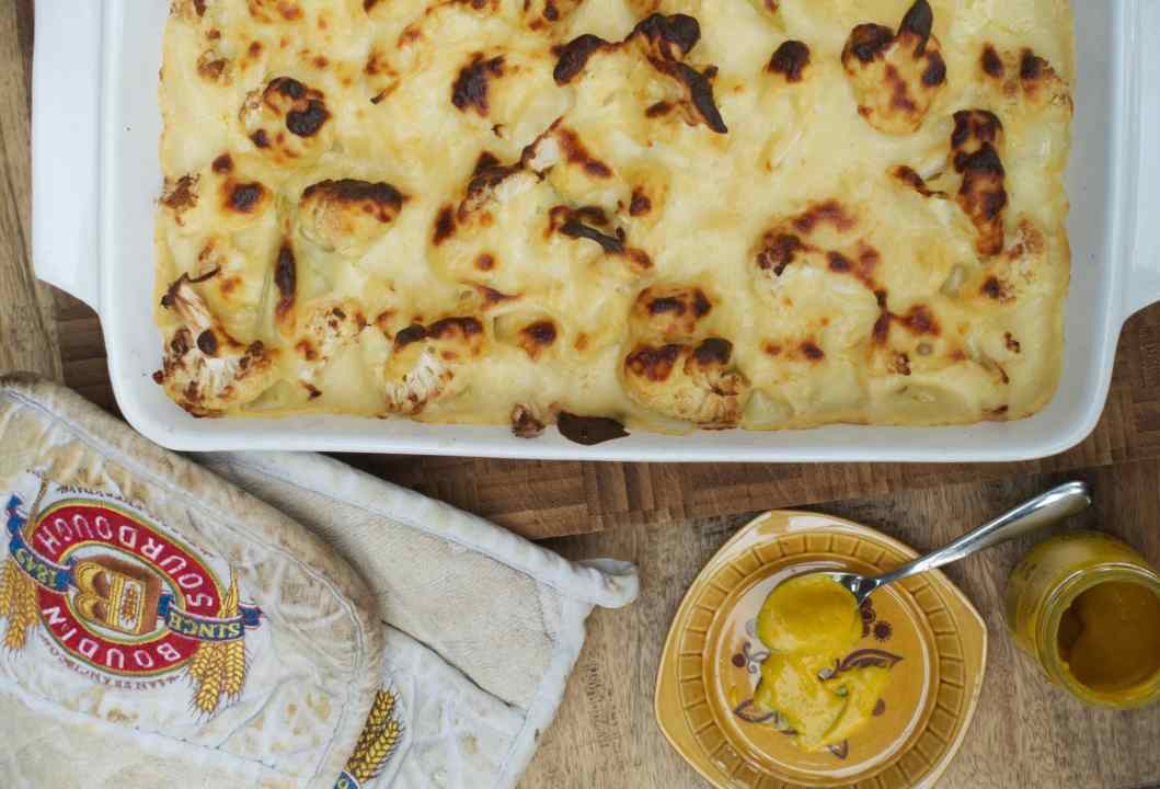 - Pour the sauce over the cauliflower, place in the oven, and bake for 40 minutes until the sauce is bubbling and leopard-spotted. Serve hot.