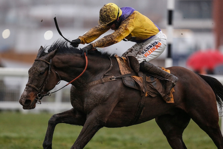 Like this season’s great discovery Bryony Frost, Jack Quinlan is as interesting to talk to after a race as he is to watch in the saddle. He was quick to pay tribute to Amy Murphy and her father Paul, who owns Kalashnikov (and who had preregistered the horse’s name ready for when she had ‘a serious weapon’ in the stable). But he acknowledged that despite being quickly out of the gate his mount couldn’t go the early pace in the conditions and had to be slapped down the shoulder all the way. ‘He’s a brilliant jumper and that’s what kept him in it. He was winging hurdles and making lengths. He’s so brave and game he finds a bit for you.’ Jack Quinlan added that he’d been lucky enough to ride some good horses for John Ferguson when Sheikh Mohammed’s former right-hand man trained ex-Godolphin stayers over jumps from a Newmarket base. ‘But a lot of them were Flat horses coming jumping. This is a proper jumps-bred horse with a huge future over fences.’ (Kalashnikov is the son of a full sister to Kicking King.)