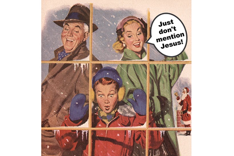 Today’s Americans are extraordinarily twee about religion. On the one hand they print ‘In God We Trust’ on banknotes, insist their leaders have a religious belief, and cite ‘the Creator’ as granting the rights of the Constitution — at least 50 per cent say religion is very important to them, compared with 17 per cent in the UK. On the other hand, when it comes to Christmas, they row back. ‘Happy Holidays’ is the only acceptable greeting. Anything more specific might be judged offensive, intrusive, coercive. Jon Sopel, himself of Jewish stock, spotted a banner in Dulles airport, reading: ‘We hope you like our holiday trees.’ They were Christmas trees. ‘Don’t mention the baby Jesus, whatever you do,’ he wrote with amusement.