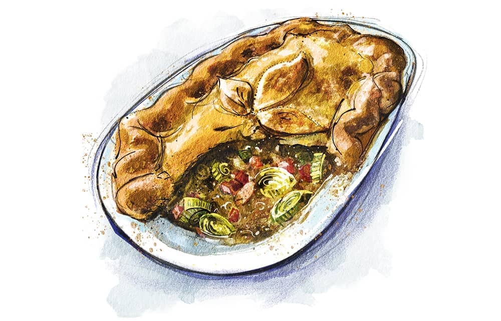 This is, as is only right and proper in this column, an old-fashioned chicken pie: big chunks of meat, lots of soft, buttery leeks, smokey nuggets of bacon, all bound together with a roux-thickened sauce (a velouté, if we’re being fancy) woken up with white wine, and enriched with just a little cream at the end. The pastry is my ideal mixture of shortcrust and suet: where it touches the filling, the crust is soft, almost dumpling-like, taking on the flavour of the sauce, but on top it will be puffed and golden, and flake as the fork touches it. Suet is a lovely pastry to work with: soft and pliable, and easy to handle – but if you don’t have the time or inclination, shop-bought puff will act as a substitute.