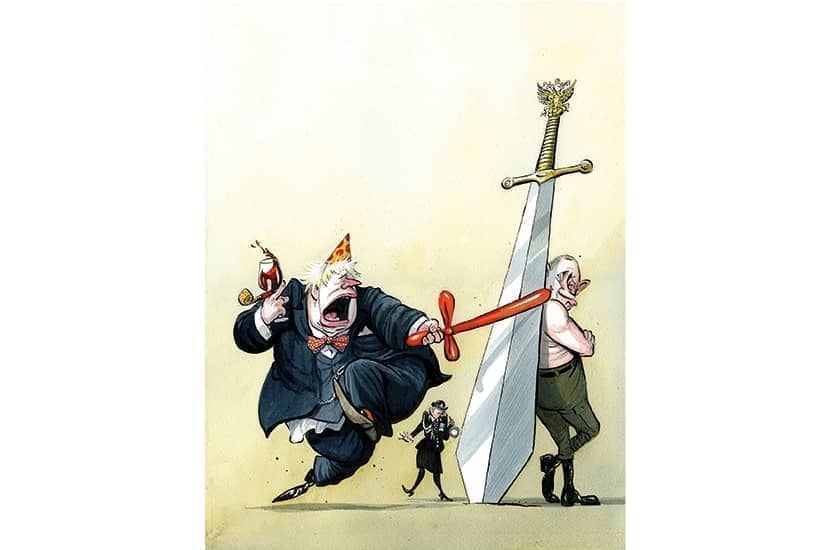 What a lucky coincidence. At the start of a week that could see the ignominious collapse of Boris Johnson’s premiership, an opportunity to go fully Churchillian has appeared out of the blue. In an unprecedentedly detailed and direct memorandum, the British Foreign Office announced that it had exposed Russian plans to mount a coup in Kiev. Johnson was quick to back the alarming news with a grave warning to Vladimir Putin. ‘The intelligence is very clear that there are 60 Russian battle groups on the borders of Ukraine, the plan for a lightning war that could take out Kiev is one that everybody can see,’ Johnson told reporters on Monday. ‘We need to make it very clear to the Kremlin that that would be a disastrous step.’ The government also announced fresh shipments of anti-tank missiles and 30 trainers from the Rangers Regiment — leading ‘God save the Queen’ to trend briefly on Twitter in Ukraine.