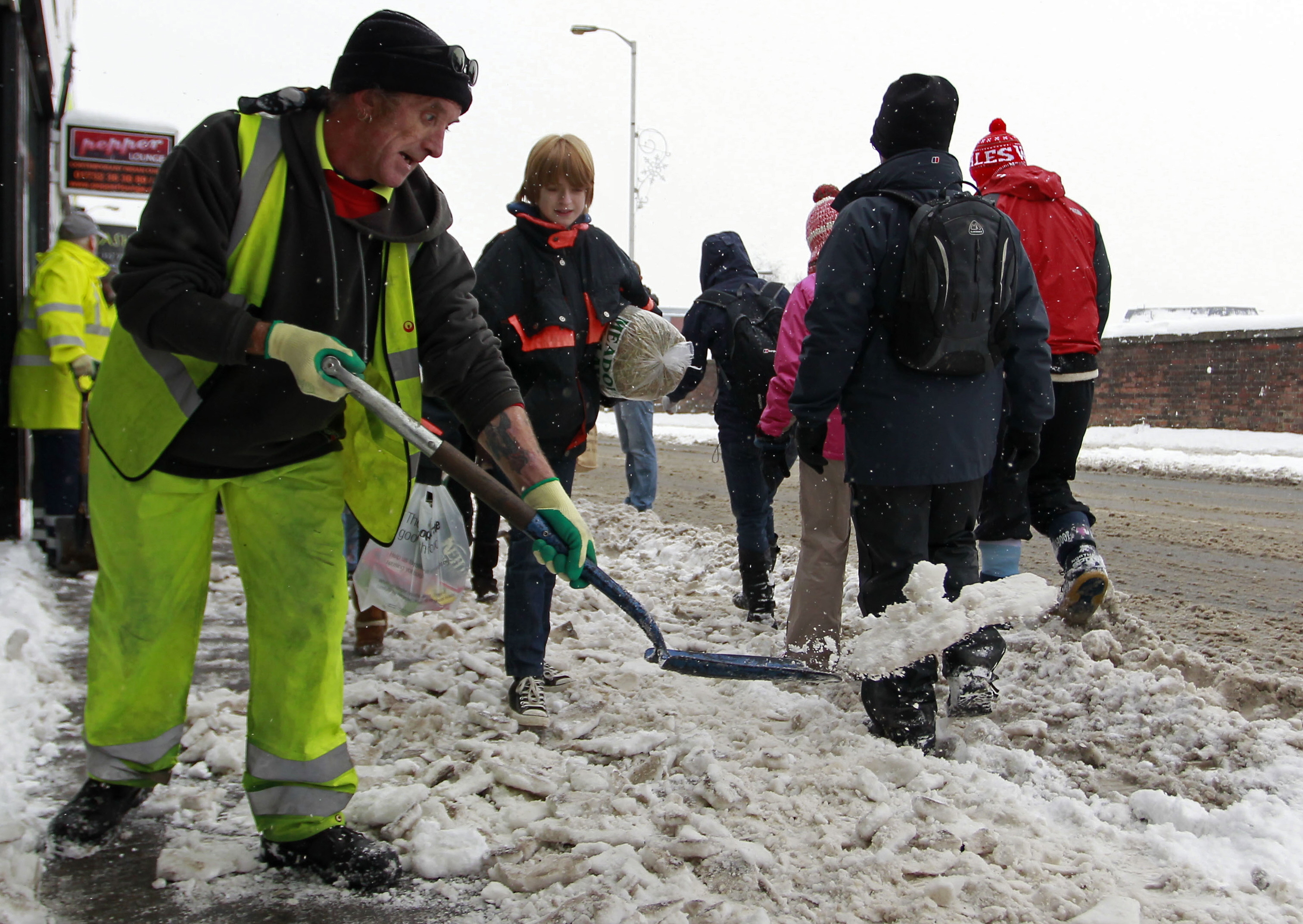 People help each other when their cars are stuck in the snow. Neighbours check on each other. Postmen ask how the elderly are coping. Neighbourhood groups get allocations of salt for use in their streets, while churches and other community organisations become distribution hubs. In Sheffield, for example, sixty volunteers have been given a tonne of grit and equipment to clear smaller roads that the council cannot reach. Companies often clear snow outside their offices.