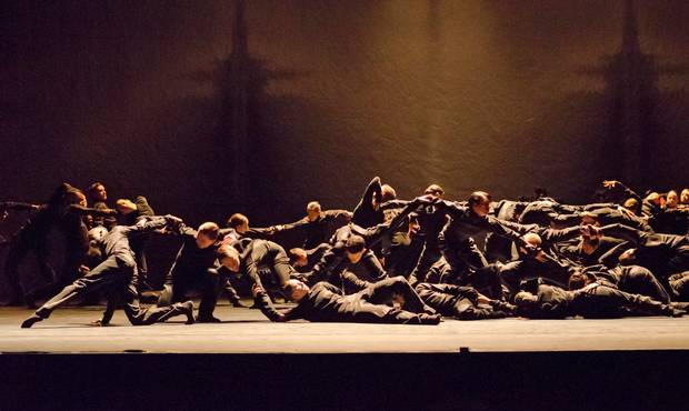 There was no narrative in Polaris yet Pite drove the stage picture with tremendous drama, most of it massed crowd movement in neck-prickling darkness, an abstract clump of black-clad bodies apparently buffeted by Adès’s extremes, from euphonium growls to highest bells. Hands and upturned faces flashed pale in precise patterns over bent backs as the ant heap ravelled and unravelled, throwing out soloists or couples in brief, light dancing. In the gloom behind them two black shapes — conning towers? industrial chimneys? — seemed to be looming. Even the rustling friction of the dancers’ suits sounded oppressive. Pite has reclaimed the Mexican wave for tragedy.