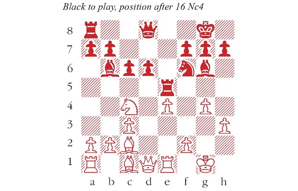 1 e4 e5 2 Bc4 Nf6 3 d3 Bc5 4 Nf3 d6 Vladimir Kramnik once played 4…O-O against me in this position, with a neat idea: 5 Nxe5 d5! 6 exd5 Re8 7 d4 runs into 7…Bxd4! 8 Qxd4 Nc6! Black recovers material and keeps the initiative. 5 O-O O-O 6 c3 Bb6 7 Nbd2 c6 8 Bb3 Re8 9 Re1 Be6 10 Bc2 Nbd7 11 d4 Bg4 12 h3 Bh5 13 g4 Bg6 14 dxe5 Nxe5 15 Nxe5 Rxe5 15…dxe5 was also fine, but Anand’s more dynamic move is tempting, in view of White’s weakened kingside. 16 Nc4 (see diagram) A serious error. 16 Kg2 was better, which threatens f2-f4-f5 to trap the bishop on g6. After 16…d5 17 f4 Rxe4 18 Nxe4 Bxe4+ 19 Bxe4 Nxe4 Black has healthy compensation for the exchange. Nxe4 Bold and correct. The idea is that 17 Nxe5 Nxf2! sets up myriad discovered checks. For example, 18 Qe2 Nxg4+ 19 Kg2 Nxe5 would leave Black well ahead. 17 Nxb6 17 Bxe4 would limit the damage. Then 17…Rxe4 18 Rxe4 Bxe4 19 Nxb6 axb6 is bad for White, but not losing by force. Nxf2 Winning by force, since if 18 Kxf2 Qh4+ 19 Kf1 Bxc2 is crushing. 18 Qd2 Qxb6 19 Rxe5 Nxg4+ 20 Kg2 Nxe5 Black has several extra pawns and an ongoing attack, so it’s all over. 21 Bxg6 hxg6 22 Qxd6 Qb5 23 Qd1 Nd3 24 b3 Qd5+ White resigns