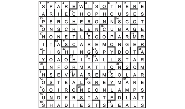 PERCH (13A), SCAR (21A and 10D), SHAD (40A), EEL (5D) AND CARP (19D) were ignored in wordplay in their clues. The other unclued lights are listed in Chambers as things you may FISH for.