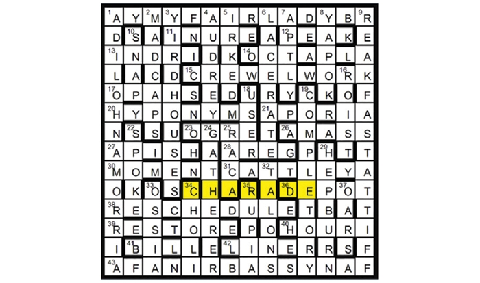 Films starring AUDREY HEPBURN (4 29) include MY FAIR LADY, BREAKFAST AT TIFFANY’S, SABRINA FAIR and ROMAN HOLIDAY in the perimeter, and (defined by the puzzle’s title) CHARADE.