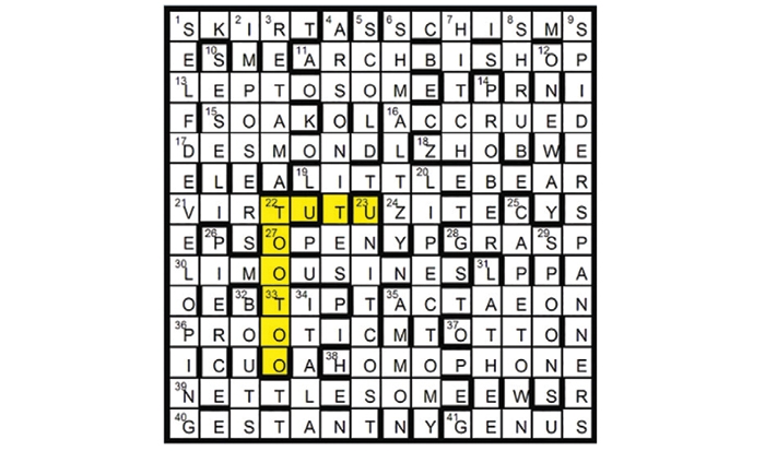 TOO-TOO is a HOMOPHONE (38) of TUTU (defined by 1A and 8, and the surname of 17, the former 11 of 25). The highlighted words, both starting at 22, combine to form a homophonous representation of the puzzle’s number.