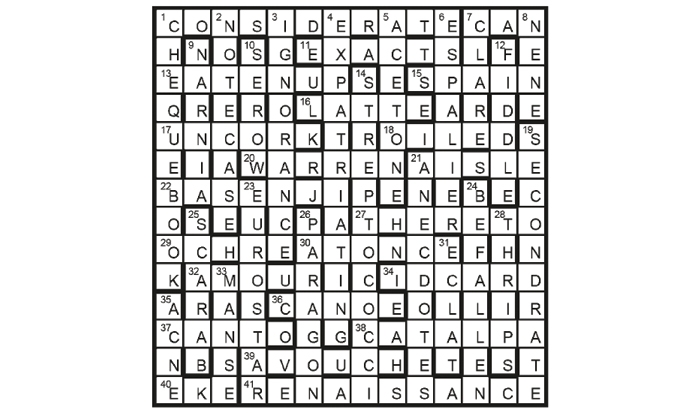 The word pyramid runs from CAN at 7A, then 35, 36, 30, 5, 2, 21D, 19 to CONSIDERATE at 1A.