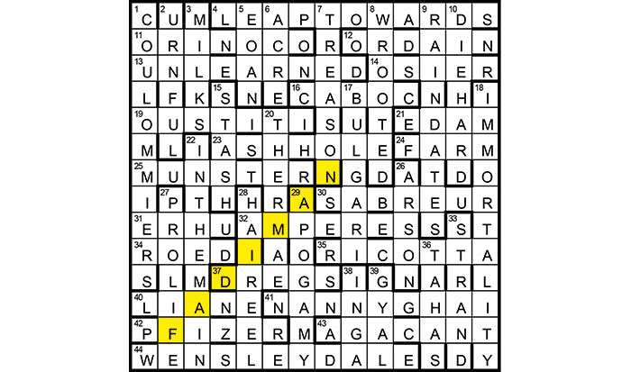 Clifton Fadiman wrote that cheese was ‘MILK’S LEAP TOWARDS IMMORTALITY’ (3/4/18). The remaining unclued lights (16, 21, 25, 35, 44 and 1) are cheeses. FADIMAN (diagonally from the 13th row) was to be shaded.