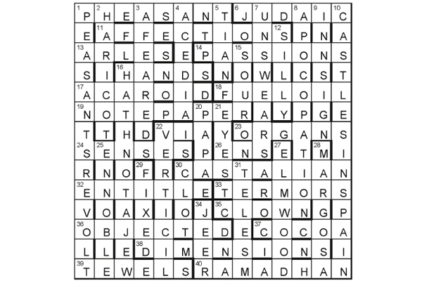 Extra letters in clues form the phrase BITE THE DUST. Thematically created entries at 10, 11, 19, 29 and 34 (in which the types of dust are pother, pollen, stour, bort and ash) are defined by 15, 30, 18, 39 and 9.