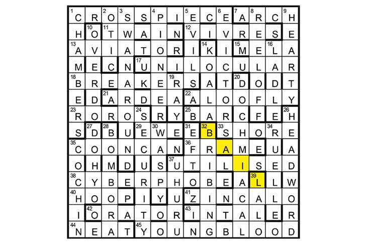 The HEADWORD (26) ‘bail’ appears six times in CHAMBERS (1D). Its different meanings include CROSSPIECE (1A), BAR (25), FRAME (36), HOOP (40), LADLE (16) and SECURITY (24). BAIL (diagonally from 32) was to be shaded.