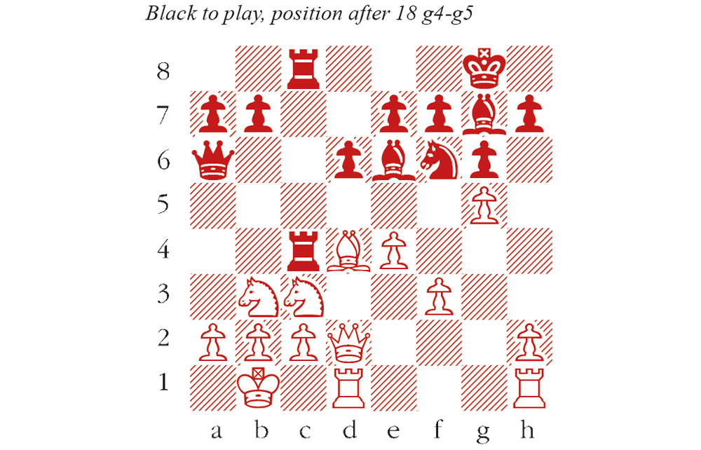 1 e4 c5 2 Nf3 g6 3 d4 cxd4 4 Nxd4 Bg7 5 Nc3 Nc6 6 Be3 Nf6 7 Bc4 O-O 8 Bb3 d6 9 f3 Qa5 10 Qd3 Ne5 11 Qd2 Bd7 12 O-O-O Rfc8 13 Kb1 Nc4 14 Bxc4 Rxc4 15 g4 Be6 16 Nb3 Qa6 17 Bd4 Rac8 18 g5? (see diag) Nxe4!! 19 fxe4 19 Nxe4 Rxd4! 20 Nxd4 Qxa2+ 21 Kc1 Qa1 mate. Bxd4 20 Nxd4 Rxc3 21 a3 21 bxc3 Qxa2+ and mate follows, or 21 Nxe6 Rxc2 22 Qd5 Qb6! 23 b3 Qf2 wins easily Qc4 22 b3 Qc5 23 Rc1 23 Kb2 is hopeless: Bxb3! 24 cxb3 e5 etc. Qxa3 24 h4 R8c5 25 Rcf1 Bxb3 White resigns