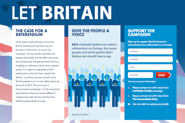 ‘Currently, only one of the main three political parties believes the British people deserve a say on Europe: the Conservatives. They are bringing forward a draft bill to legislate for an In-Out referendum before the end of 2017, following a renegotiation. This bill will need the support of either Labour of Lib Dem MPs to pass. Some issues are bigger than party politics. It’s time to Let Britain Decide.’