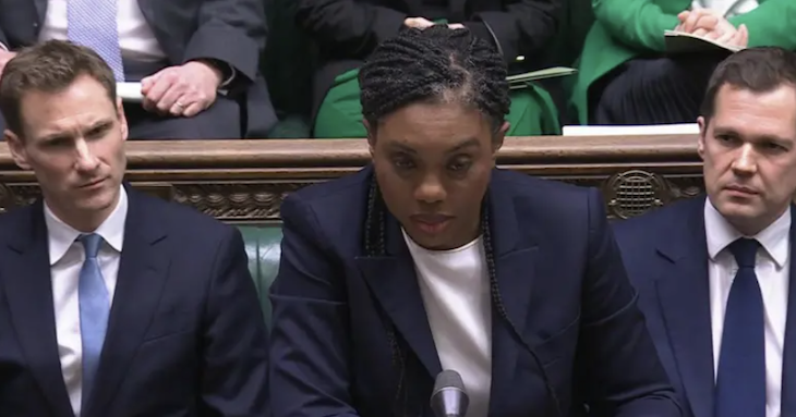 Badenoch complained again that he wasn’t answering her question. What she wanted to know was whether the government was going to introduce new legislation clarifying the right to a family life, and whether he agreed that ‘we should legislate even if lawyers warn that this might be incompatible with human rights law’.