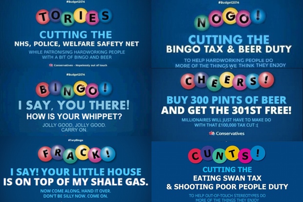 As Isabel reported yesterday, Conservative HQ’s ineffectual response to the misjudged Bingo poster suggests that they hoped the anger could be contained amongst the anti-Conservative brigade, many of whom spend their days tweeting abuse to George Osborne. But the number of spoofs (a selection can be seen above) and the fury within the Conservative party made this irresistible for the print media. One day after the row, there were still 3,400 tweets an hour, or 56 every minute, of #ToryBingo, according to Hashtags.org: