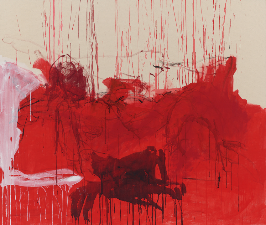 Her painting style has grown to meet her experience. There is a new urgency, a Cy Twombly-like attention to dripping paint, and an obsession with red. ‘I watched Myself die and come alive again’ (2023) has a chilling black spook at the end of the bed. An essay in the catalogue goes a bit too far: ‘While Christ’s wound represents the fulfilment of a prophecy and the verification of death, Tracey’s depiction of her stoma points to survival and echoes the transition into another life.’