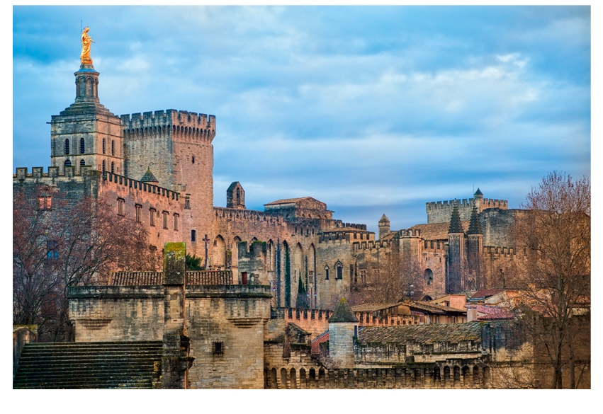 Can you think of another walled town which has a great spur of rock overlooking a vast river with a medieval bridge that has its own song? To get to the Rocher, you emerge from the top of the square, through a narrow street, and come first upon the great Palais des Papes itself. The popes were only in Avignon for 70 years in the 1300s, but for most of those 70 they were building this most severely Gothic and thick-walled palace-fortress. You’ll have to visit it while you’re here — but not on the first day. Be glad that you’ll no longer have to be shown round by a man who tells the same unfunny Pope jokes every time. It’s the audioguide era now. It’s a good place to get cool on a hot day, and the fresco murals in the Pope’s bedroom are heavenly. The birds have escaped from their cages and are flying among the foliage.