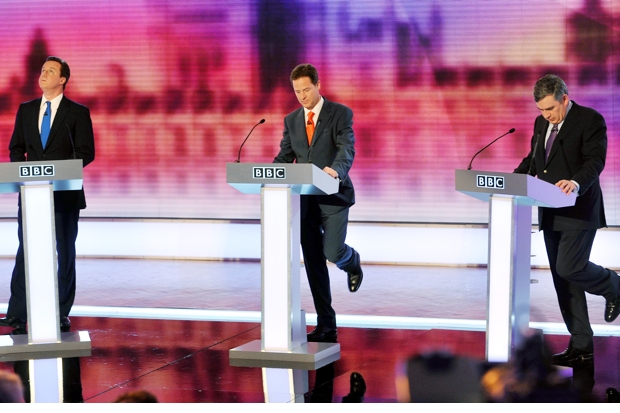 I wish I could get worked up about the televised election debates (or lack thereof). I can understand that it’s a very important to the broadcasters, who don’t mind reducing the campaign to three US-style standoffs. But if they don’t go ahead, is it really an outrage? Is our democracy really the poorer for it? When broadcasters are angry, they have a platform to vent – which is why the furore is been given disproportional coverage. But without the debates, the election will go on in the way that every election before 2010 went on. And I rather welcome that. The TV debates do make good entertainment but they do rather take over the campaign – and put the whole thing a little more in the hands of the political and media elite. And a little less in the hands of voters like Mrs Duffy who torpedoed Gordon Brown last year. Also, 98pc of us don’t get the choice to vote for or against the people we watch on the telly in these debates. Indeed, after the last election, it was briefly possible that we’d get a new Labour leader to do a deal with the LibDems – so the new Prime Minister would be one who didn’t appear in any of the much-hyped debates. Hence the flaw in the whole idea: TV debates seek to impose a US-style presidential dynamic on a UK constituency system. It’s an awkward fit, hence today’s chaos. Miliband may end up Prime Minister, propped up by the SNP who dump him in time for their 2016 Holyrood election. In a hung parliament the Tory leader – probably Boris Johnson – could form a government. So Britain could end up watching 7-leader debate yet still end up governed by someone else. And Cameron’s right – if you invite the Greens why not the DUP? They are right to complain about their proposed exclusion by the broadcasters. They could well be kingmakers after the next election. We could do with knowing more about them. Yet they get shunted out of the picture because Ulstermen would ruin the optics. Peter Robinson, DUP leader, is understandly angry about all this asking “just who the broadcasters think they are, that they can set down a diktat?” It’s a good point. But no one is in charge or these debates, no one has authority.  Of course, Cameron has himself to blame for hyping all of this up in the first place (or allowing Andy Coulson to). Five years ago it was him leaning across the despatch box asking Gordon Brown what he was scared of. Now it’s Miliband’s turn to use the pious language saying that these debates ‘belong to the British people’ – as if they were somehow an ancient tradition rather than a Coulson spin wheeze. So Cameron deserves to take some stick for chickening out of the debate tradition which he invented (“part of the modern age” etc) and Labour is richly entitled to mock him for a volte-face. The TV debates may be a bad idea, but they were his bad idea. Yet still, the excitement is overdone. TV debates just don’t fit the UK political system, and their apparent collapse is proof of this basic point.