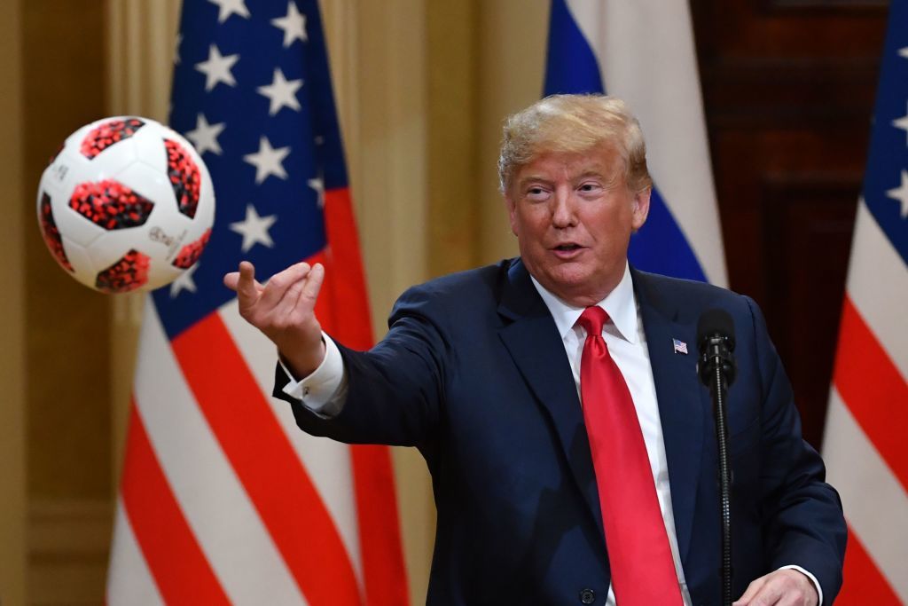 TOPSHOT – US President Donald Trump throws to his wife (unseen) a ball of the 2018 football World Cup that he received from Russia’s President as a present during a joint press conference after a meeting at the Presidential Palace in Helsinki, on July 16, 2018. – The US and Russian leaders opened an historic summit in Helsinki, with Donald Trump promising an “extraordinary relationship” and Vladimir Putin saying it was high time to thrash out disputes around the world. (Photo by Yuri KADOBNOV / AFP) (Photo credit should read YURI KADOBNOV/AFP/Getty Images)