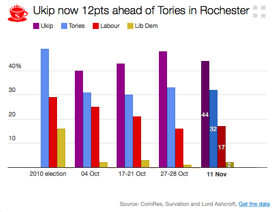 Ukip is still on track to pound the Tories into second place in the Rochester and Strood by-election, but not necessarily at next year’s general election, according to a new poll from Lord Ashcroft. The latest polling (see chart above) puts Tory defector Mark Reckless on 44 percent, the Conservatives on 32 percent, Labour on 17 percent and the Lib Dems on 2 percent.
