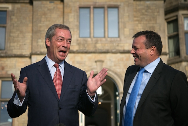 5pm came, and up popped Nigel Farage and Arron Banks, a Tory donor who defected to Ukip earlier this week. Banks was increasing his donation to the party from £100,000 to £1 million, partly because William Hague had this morning said he’d never heard of the guy ‘so we’re not going to get too upset’ about his defection.