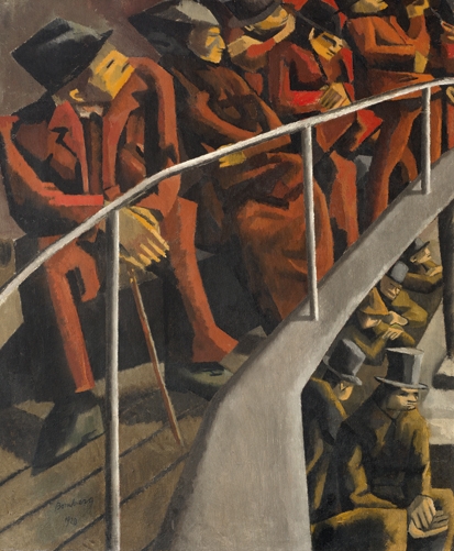 There are several pieces of sculpture in this room, the most dramatic being the strongly chopped and simplified ‘Seated Torso’ by Frank Dobson, in Ham Hill stone, and placed in a vitrine by itself. Gaudier-Brzeska’s ‘Bird Swallowing a Fish’, although a powerful work, is more familiar than the underrated Dobson, and has been placed in a cabinet with Epstein’s obscure ‘Flenite Relief’ that actually makes both pieces difficult to see properly. Of the other paintings in this ground-floor gallery, there’s an intriguing nude by Frederick Etchells, better known as an architect than painter, all scarified surface and compressed forms, a modest-sized Wyndham Lewis work on paper from c.1912, a small etching by C.R.W. Nevinson, and a stark and troubling image by Jacob Kramer called ‘Clay, or The Anatomy Lesson’ (1928). On the end wall in glory is hung Matthew Smith’s vibrantly coloured ‘Fitzroy Street Nude No. 2’ (1916), a real corker of a painting, and one of the show’s many high spots.