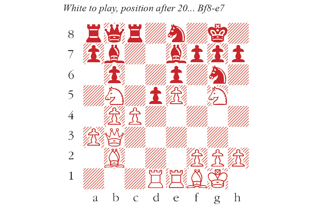 1 d4 Nf6 2 c4 e6 3 Nf3 b6 4 a3 Ba6 5 Qc2 Bb7 6 Nc3 c5 7 e4 cxd4 8 Nxd4 Bc5 8…Nc6 is a decent alternative, but the game Christiansen-Karpov, Wijk aan Zee 1993 ended abruptly: 9 Nxc6 Bxc6 10 Bf4 Nh5 11 Be3 Bd6?? 12 Qd1! forked knight and bishop so Karpov resigned. 9 Nf3 Nc6 10 b4 Be7 11 Bb2 Qb8 12 Rd1 O-O 13 Be2 d6 14 O-O Rc8 15 Rfe1 Bf8 16 Bf1 Ne7 17 Nb5 Ne8 17…Ng6 was much the lesser evil, though allowing 18 Bxf6 gxf6 was unattractive. 18 Ng5 This, combined with the previous knight lunge, is the star idea, though Suleymenov has not yet had to stake anything significant. He may well have seen that 18…h6 can be met by 19 Nxf7 Kxf7 20 e5, with a powerful, albeit complex attack. But any grandmaster would readily see that 19 e5 hxg5 20 exd6 will soon recover the knight, while retaining a safe edge. Ng6 19 e5 Now 19… dxe5 20 Bxe5 traps the queen, as capturing the bishop allows mate on h7. d5 20 Qb3 Be7 (see diagram) 21 Nxf7! Tearing into the light squares. Spectacular though this is, the sequence which follows is entirely findable for a player with strong tactical vision. Kxf7 22 cxd5 Bxd5 23 Rxd5 exd5 24 Qxd5+ Kf8 25 Nd4 Suleymenov has just two pawns for the rook, but neither of the knights on e8 or g6 contributes to the defence of the light squares, which are critically weak. The primary threat is 26 Ne6+ Kg8 27 Ng5+ Kh8 28 Nf7+ Kg8 29 Nh6+ Kh8 30 Qg8# A crucial detail is that 25…Nc7 26 Qf3+ Kg8 (26…Ke8 27 Bc4 is also decisive) 27 Nc6! Qb7 28 Nxe7+ wins the queen. Carlsen tries the only plausible alternative to cover e6. Nf4 26 Qf3 Kg8 27 Qxf4 The material balance is restored. Carlsen’s king remains in desperate trouble, and his clumsy pieces contribute little to the defence. Qb7 28 Nf5 b5 29 Bxb5 Bf8 30 Bc4+ Kh8 31 Nh6 Black resigns