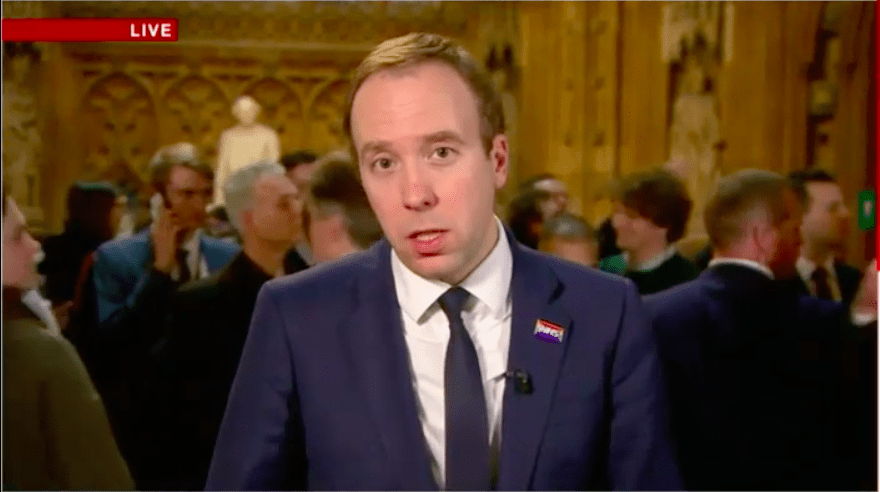 Theresa May made history tonight by notching up the largest defeat for a sitting government in British political history. But despite 118 Tory MPs rebelling against the Government, May can still count on some of her colleagues to try and defend her. Step forward, Matt Hancock. The health secretary popped up on the BBC to trot out the PM’s Brexit plan B: go back to the Commons and listen to MPs on what they do want. Unfortunately for Hancock, his attempt to explain what happens next didn’t inspire Mr S with much confidence: