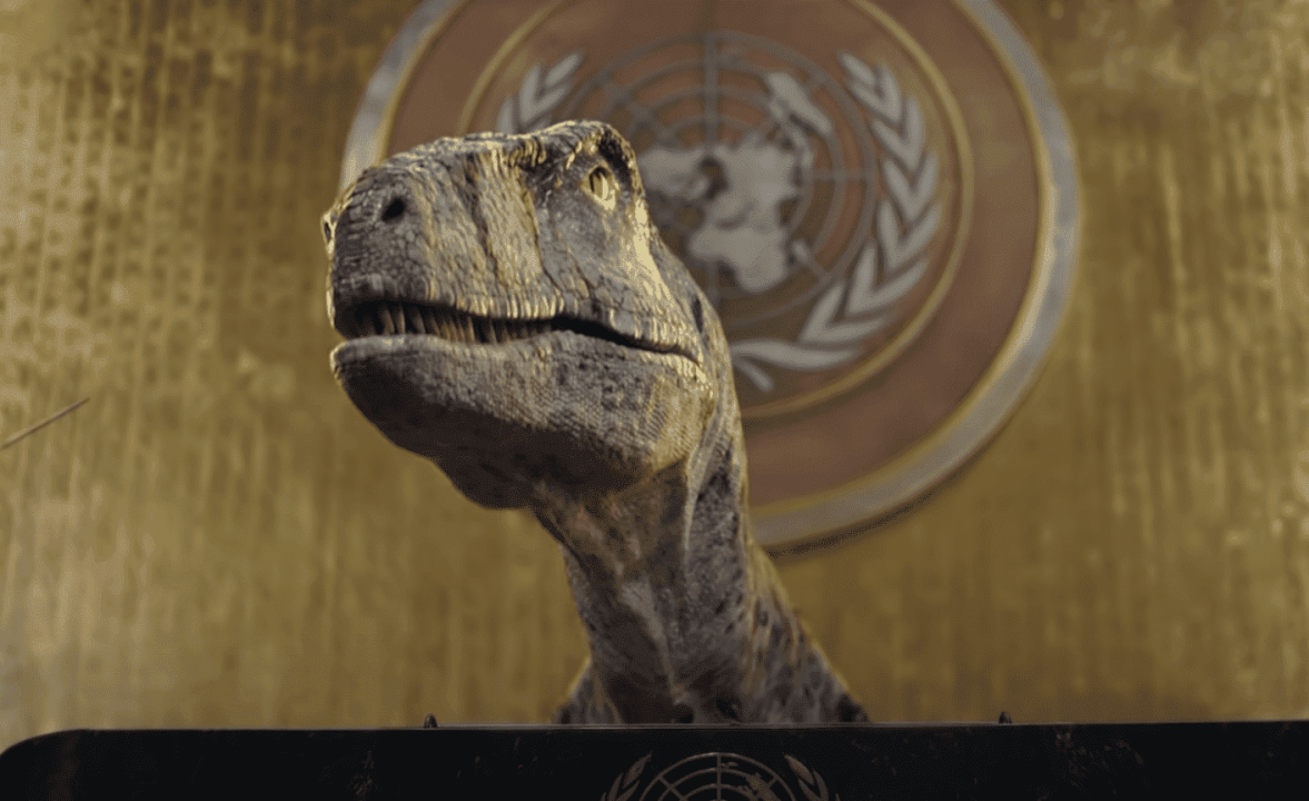 The two minute clip features a (presumably) blood-thirsty tyrannosaurus taking to the podium at the UN General Assembly to deliver a banal speech lecturing humanity on its shortcomings, somehow restraining itself from devouring the surrounding smorgasbord of plenipotentiaries. Sounding like a cheap hood from an 80s mafioso movie, the dinosaur masters the platitudinous cliche-riddled jargon so beloved of such emissaries, unsurprisingly receiving an appropriately orgastic ovation.