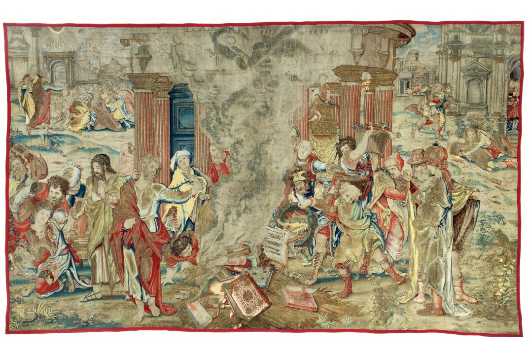 ‘Saint Paul Directing the Burning of the Heathen Books’ by Pieter Coecke van Aelst is a monumental tapestry, nearly 20ft long and 12ft high. It is the sole survivor of a series of nine tapestries that Henry VIII commissioned in the mid-1530s on the life of Saint Paul. Tapestries were the currency of culture in kingly circles at the time (a generation later, the taste had turned to Titians). Only the very wealthiest could afford them. Half a dozen gold-embroidered tapestries would set you back almost as much as a fully armed warship. Van Aelst’s piece became one of the Royal Collection’s most expensive objects. Today monumental woven marvels are not a curatorial must-have, and the institutions that possess them – the Historic Royal Palaces and the V&A in particular – have many in storage. In the battle for space, they are dreadnoughts, superannuated, off-message.