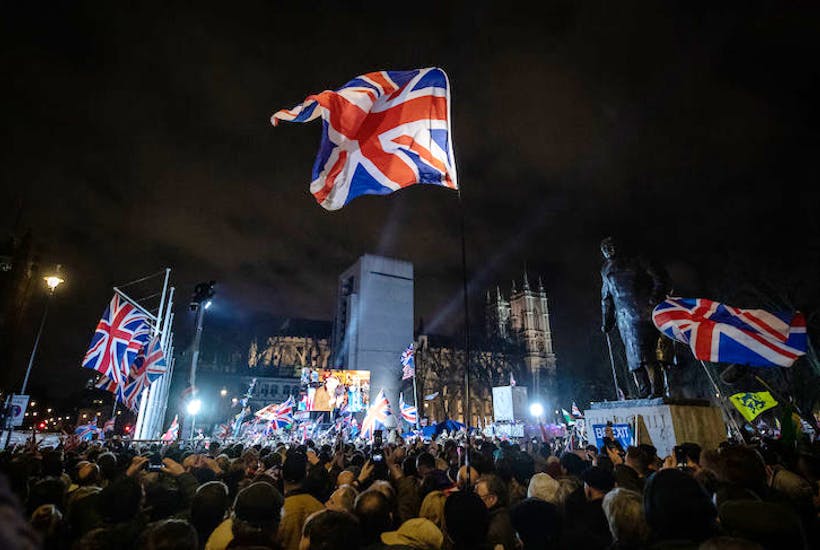 Remainers were there too. The first people I met at the Brexit Day festivities were opposed to the whole idea. I found them on Westminster Bridge, a man and his wife, posing with an EU flag. When the man spoke his voice faltered as if his pet spaniel had just died. ‘I married a German woman. I’ve been brought up to tolerate other cultures and lifestyles.’ I asked which of the many crises outlined by Project Fear would strike us first. ‘Economic slump,’ he said. Will Britain ever re-join? ‘Maybe in two generations.’