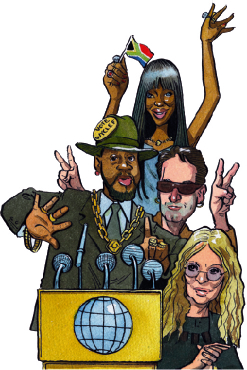 It is why the hilarious and, frankly, talentless Wyclef Jean is posed to become president of an entire country, even if it is only Haiti. These are two sides of the same coin, or perhaps even the same side of the same coin; slebs are indulged by politicians, are invited to meet with them, to divest themselves of their ill-considered opinions (opinions almost always forged in the sticky cradle of sentiment), to accompany them on fact-finding missions across the world — as the fabulously self-aggrandising Bono once did under the Bush administration.