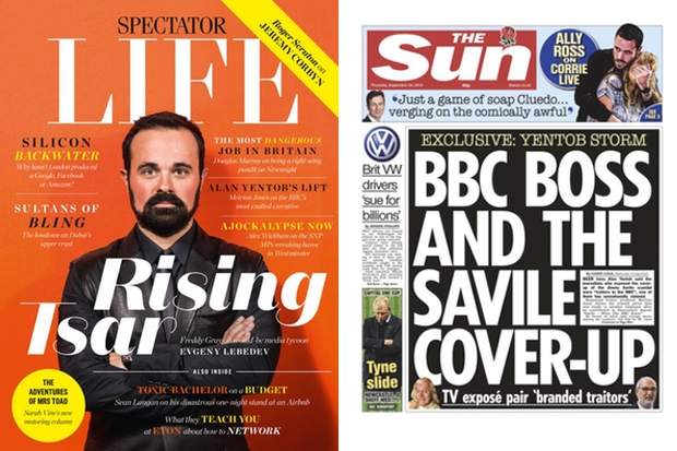 I wanted to let you know about the new issue of Spectator Life that’s out today – free with the latest issue of the Spectator. It’s my first issue in charge as editor and I’m pleased to say that one of our stories – a profile of Alan Yentob by ex-Newsnight producer Meirion Jones – has made it on to the front page of today’s Sun. It’s a great read. The Sun has splashed on the allegation that Yentob branded Meirion and his fellow producer Liz MacKean ‘traitors to the BBC’ after they publicly complained about the Beeb’s decision to pull the film they’d made exposing Jimmy Savile as a paedophile a year before he died. Yentob strongly denies saying this, but Jones’s source – a BBC colleague – claims to have heard it directly from Yentob’s mouth and sent an email to the Director General, which Jones has a copy of, complaining about Yentob’s remark. The Conservative MP Philip Davies has called for an investigation into the matter, so we may not have heard the last of it.