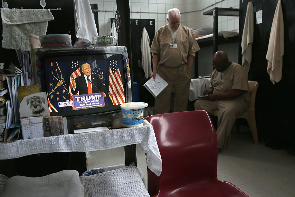 ENFIELD, CT – MAY 03: Television news features Donald Trump over a prisoner’s bunk at the Veterans Unit of the Cybulski Rehabilitation Center on May 3, 2016 in Enfield, Connecticut. Connecticut is one of only four states where voting rights are restored to convicted criminals immediately upon completion of their prison and parole time. The Veterans Unit houses some 110 inmates, all U.S. military veterans convicted of crimes ranging from petty larceny to murder. Prisoners at the unit typically have less than two years left on their sentences. The unit is part of a Connecticut Department of Correction program to turn some prisons into reintegration centers to prepare inmates for successful re-entry into society. Criminal justice and prison reforms are taking hold with bi-partisan support nationwide in an effort to reduce prison populations and recidivism. The state’s criminal justice reforms fall under Connecticut Governor Dannel Malloy’s “Second Chance Society” legislation. (Photo by John Moore/Getty Images)