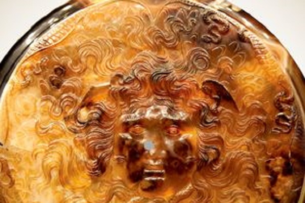 At least one of the many people who inherited it aimed to change that function. Around the time Romanos II, son of Constantine VII, was ruler over Byzantium, someone drilled through its middle to transform it into a Christian chalice. But try as one might, even a hole could not conceal the fact that the Tazza started life as a thoroughly pagan objet d’art. The alteration meant that the Gorgon Medusa that adorns its outer façade now had an enormous nose piercing.