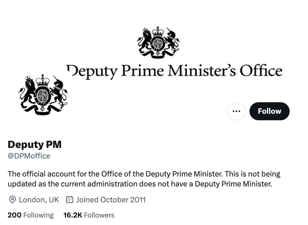 According to a Freedom of Information request to the Ministry of Housing, Communities and Local Government (MHCLG), just ‘ten civil servants worked in the Deputy Prime Minister’s office as of 18 August 2024.’ This single private office is stretched over the MHCLG on 2 Marsham Street and the Cabinet Office on 70 Whitehall. The latter department insists that there is moreover ‘no specific staff or budget allocation’ for Rayner on its premises. Adding insult to injury is the bio of the official Twitter account of the Deputy Prime Minister’s Office. It reads simply: ‘This is not being updated as the current administration does not have a Deputy Prime Minister.’ Ouch.