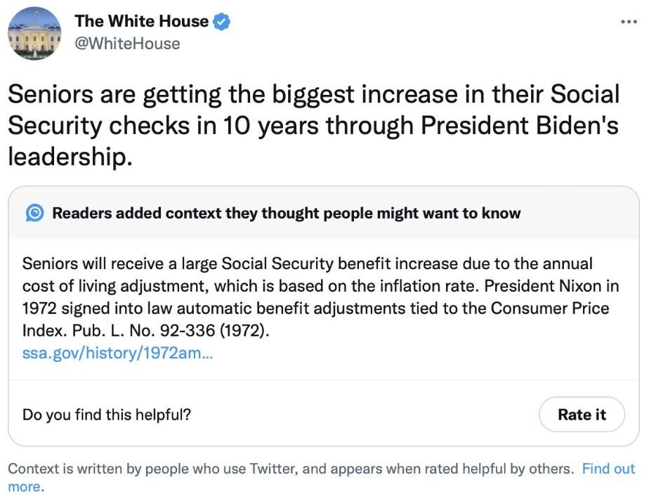 You know the Democrats are grasping at straws when you see the White House Twitter account praising President Biden for this year’s increased Social Security checks. Particularly, Cockburn is at pains to point out, as the increase in Social Security is indirectly indexed to inflation.