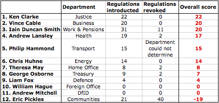 Each time politicians fight regulation, regulation normally wins. So far it seems like this coalition government is no different. John Redwood has been busy tabling parliamentary questions asking each department how many regulations have been introduced, and how many repealed. Rather than “one in, one out” in turns out that two regulations have been introduced for every one revoked. Eric Pickles emerges as the star, having revoked twice as many as he introduced. But the rest? Here’s the league table: