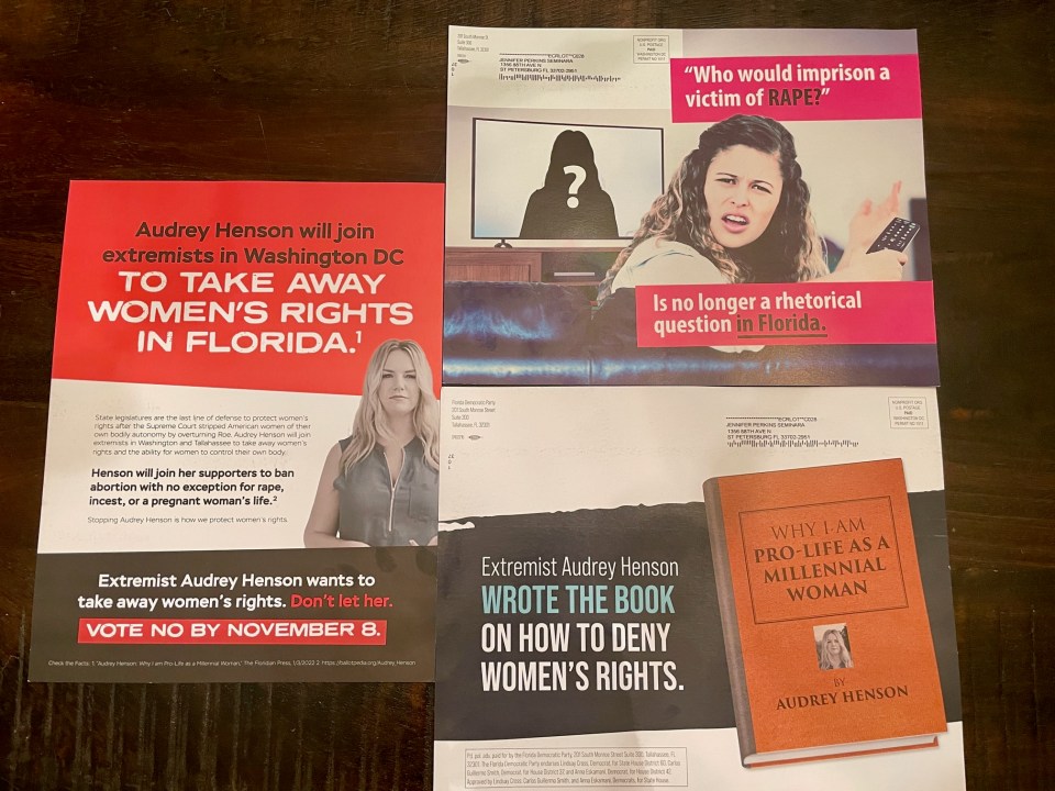 Last week, I got three different flyers about “extremist Audrey Henson,” a young Republican candidate for the Florida House of Representatives, all concerning her alleged support for criminalizing abortion, even in cases of rape and incest. One featured an image of a book supposedly written by Ms. Henson with the title, “Why I am Pro-Life as a Millennial Woman.” It claimed that she “wrote the book on how to deny women’s rights.” Another featured an image of an outraged woman holding a remote control with the title “Who would imprison a victim of rape?” and claimed she was “so extreme [that] she supports criminalizing the victims of rape and incest.”