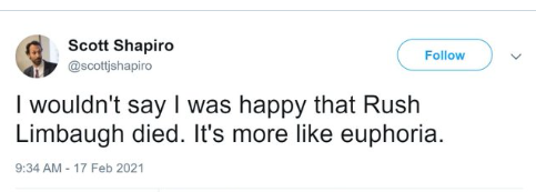 To take one example, a Yale Law professor tweeted he wasn’t just happy Limbaugh had died, he was euphoric.
