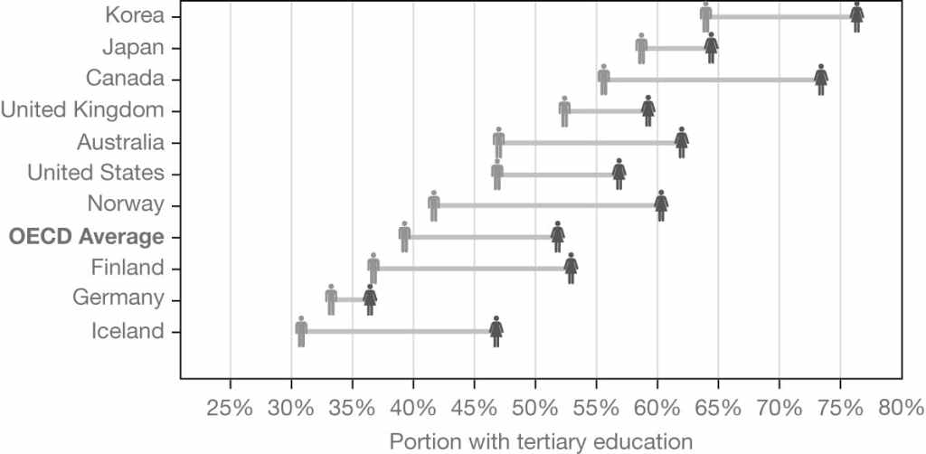 In every country in the OECD, there are now more young women than young men with a bachelor’s degree. Figure 1.3 below shows the gap in some selected nations. As far as I can tell, nobody predicted that women would overtake men so rapidly, so comprehensively, or so consistently around the world.