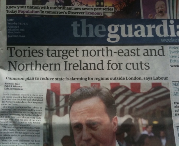 Here he was merely restating the fifth of Osborne’s eight pledges. But as Iain Martin suggested at the time, this would allow Labour to misrepresent this as a “Cameron to slash spending” story – when he clearly said he wished to decrease the ratio by growing the local economy (or ‘private sector’, to use Labour’s argot). Right on cue, The Guardian produced this following – and misleading – front page headline yesterday:“In Northern Ireland, it is quite clear – and almost every party accepts this – that the size of the state has got too big. We need a bigger private sector. There are other parts of the country, including the north east. The aim has got to be to get the private sector, to get the commercial sector, going.”