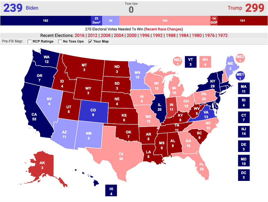 If I had to predict what I think will happen in seven weeks, I’d come down to a 299 to 239 Trump reelection victory. Each side would win the same states won in 2016, except I’d give Trump New Hampshire and Biden Arizona. That means I think Trump will again sweep the blue-collar states of Michigan, Ohio, Pennsylvania, and Wisconsin, with a smaller margin in Ohio and larger margins in the other three than in 2016. The most likely state to change columns over the next seven weeks would be Arizona, as I increasingly think that might be the closest battle of the election. The two states to watch for a surprise are Minnesota flipping to Trump and North Carolina going for Biden.
