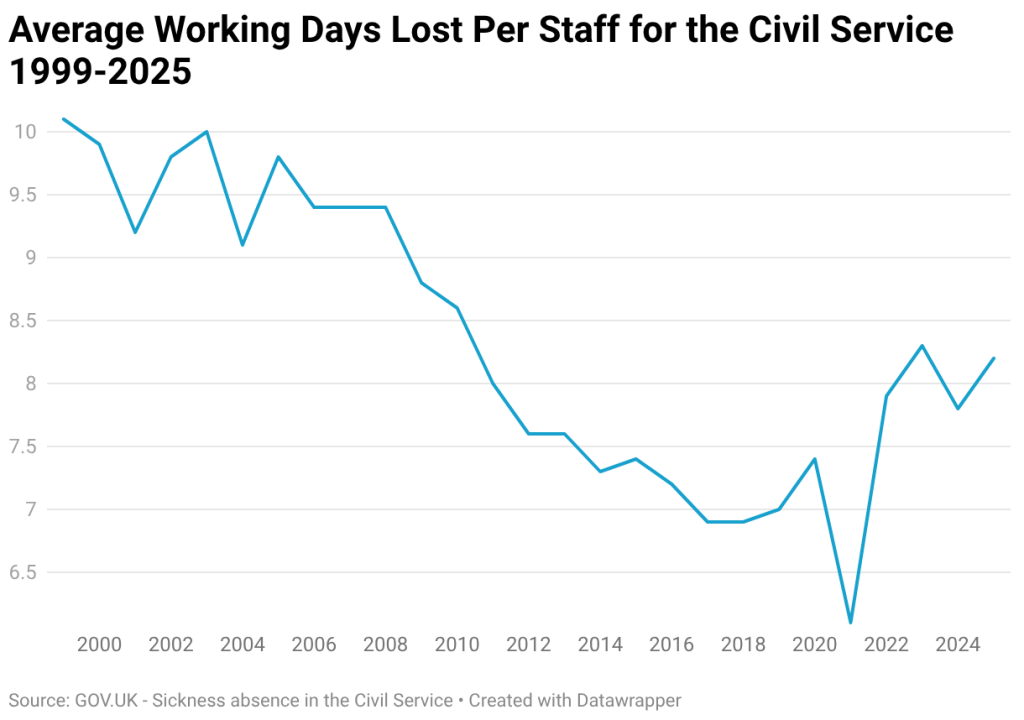 I always think the amount of time people have off sick is (other things equal) quite a good proxy for morale and performance management. And when we look at the data we can see both the attempt to get a grip after 2010 and the way that petered out before the pandemic and started to backslide after it. (This data excludes the effect of Covid absences).