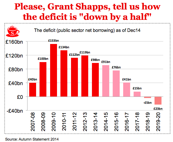 So why is Shapps – usually a very honest politician – stretching the truth until the elastic snaps? My hunch is that he is under orders. The Treasury has decreed that the deficit has halved, and every Tory MP has been ordered to say this. The calculation is that, apart from bloggers, no one will really pick them up on it because what journalist wants to bore their readers with arguments involving phrases like “deficit/GDP ratio”?