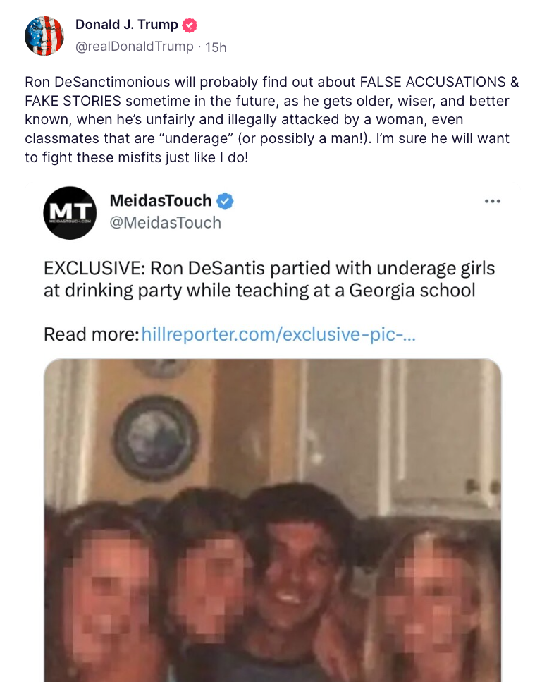 The only thing we can say for certain is that Trump will not give up his 2024 presidential campaign over the Daniels story — charge or no charge. He’ll probably use his jailbird mugshot as a campaign poster. President Trump’s great genius is for publicity — the grubbier the better — and he appears to be firing on all cylinders at the moment. Yesterday, on Truth Social, he re-posted a picture of Ron DeSantis partying with young girls, playfully warning his rival about the perils of fake news while also implying that DeSantis was gay.